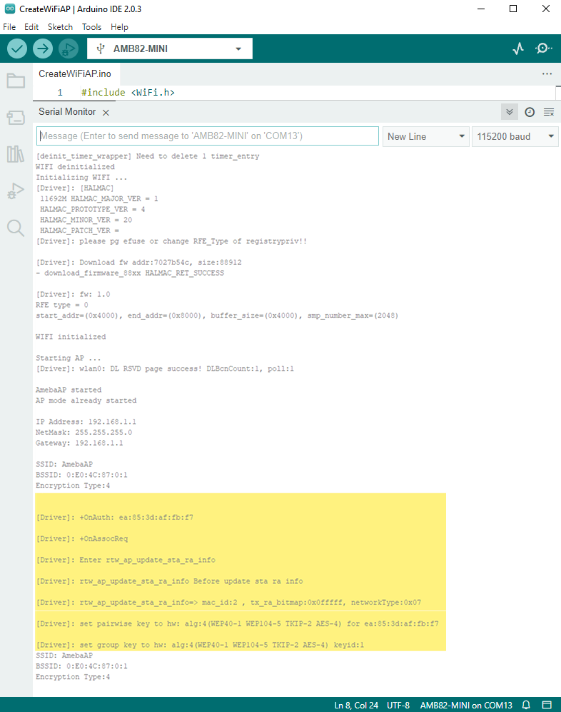 In the figure below, we show the messages shown in serial monitor when a station connects to Ameba AP in security mode: