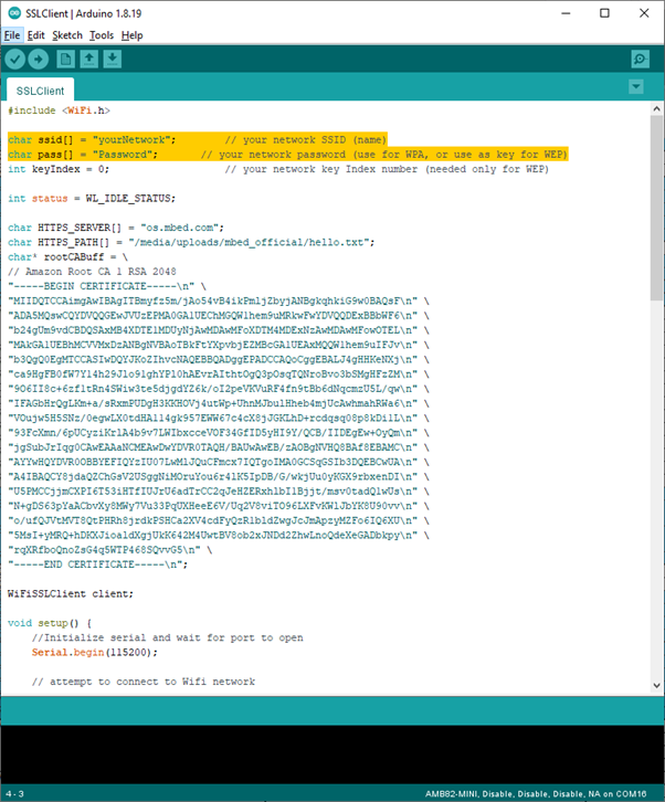 Open the “WiFiSSLClient” example in “File” -> “Examples” -> “WiFi” -> “SSLClient”.