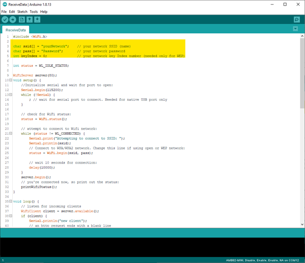 In the sample code, modify the highlighted snippet and enter the required information (ssid, password, key index) required to connect to your WiFi network.