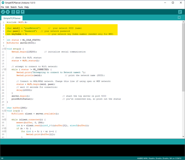 Then, open the Simple WiFi Server example in “File” -> “Examples” -> “WiFi” -> “SimpleTCPServer”: