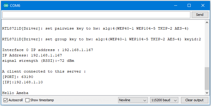 In this example, we first connect Ameba to WiFi, then we use Ameba as server to communicate with client.