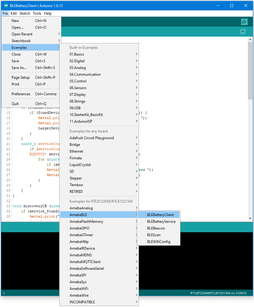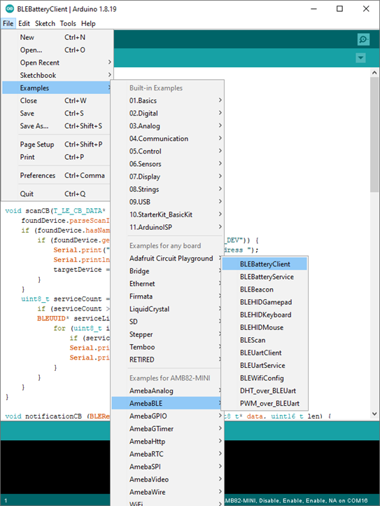 For the second Ameba board, open the example Files -> Examples -> AmebaBLE -> BLEBatteryClient
