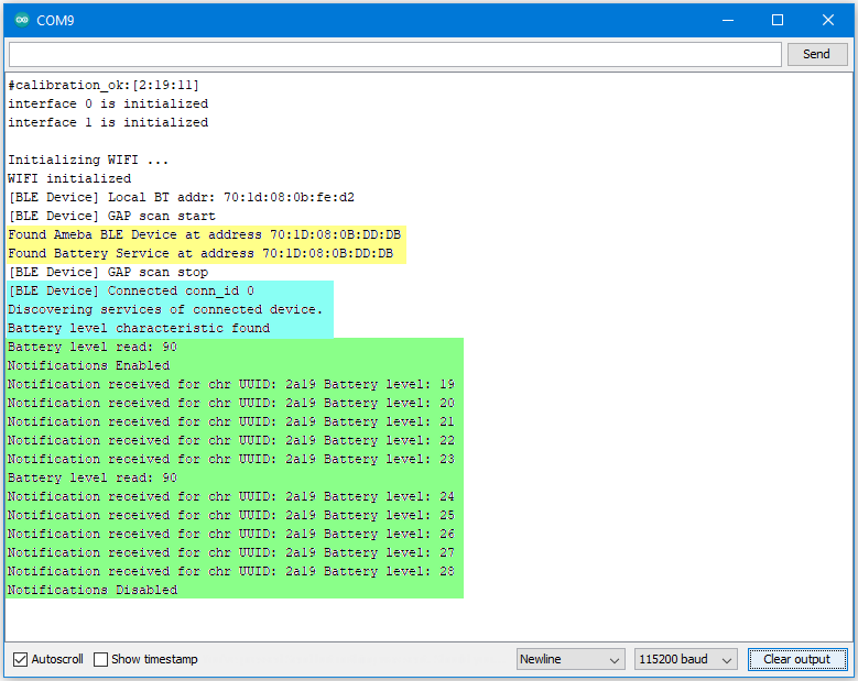 Open the serial monitor and observe the log messages as the Ameba board with the battery client scans, connects, and reads data from the Ameba board with the battery service.