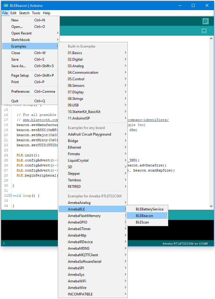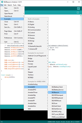 Open the example, Files -> Examples -> AmebaBLE -> BLEBeacon