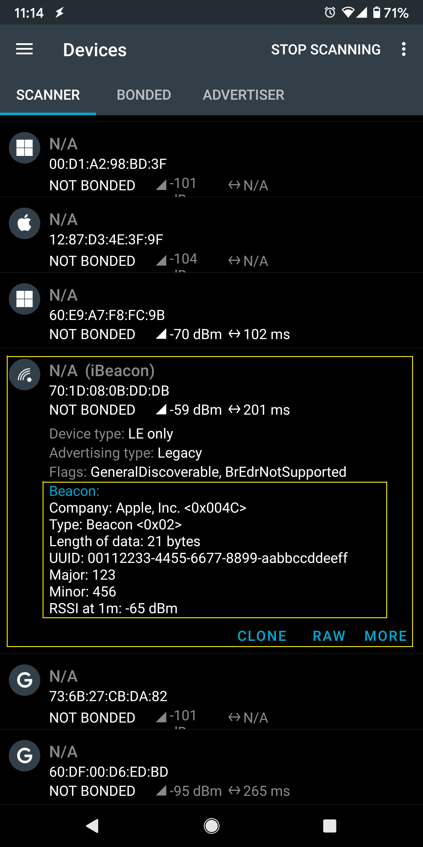 If you happen to be in an environment with multiple BLE beacons, you can tap the entries to expand them, and verify that the beacon data is identical to the data in the sketch.
