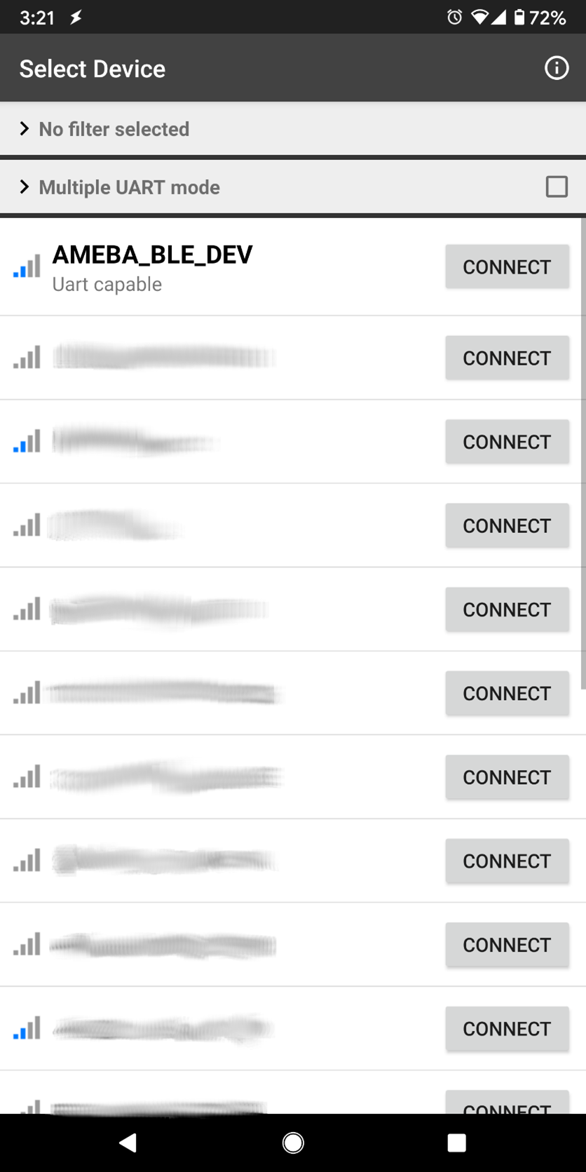 Open the app on your mobile phone, scan and connect to the Ameba board shown as AMEBA_BLE_DEV and choose the UART function in the app.