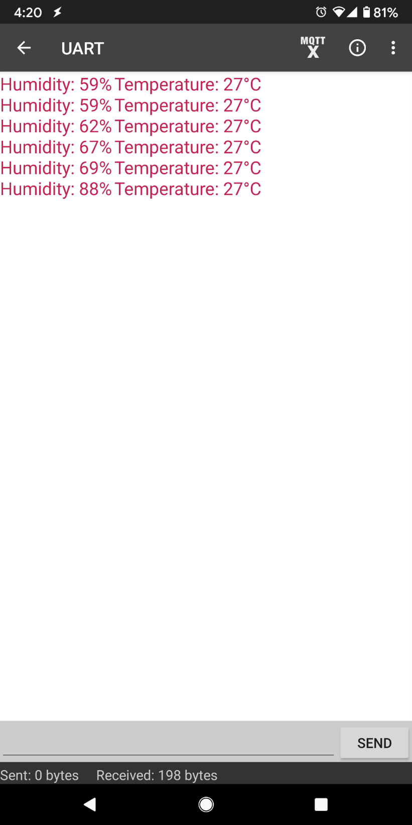 After starting the UART function, notifications should be received every 5 seconds containing the measured temperature and humidity.