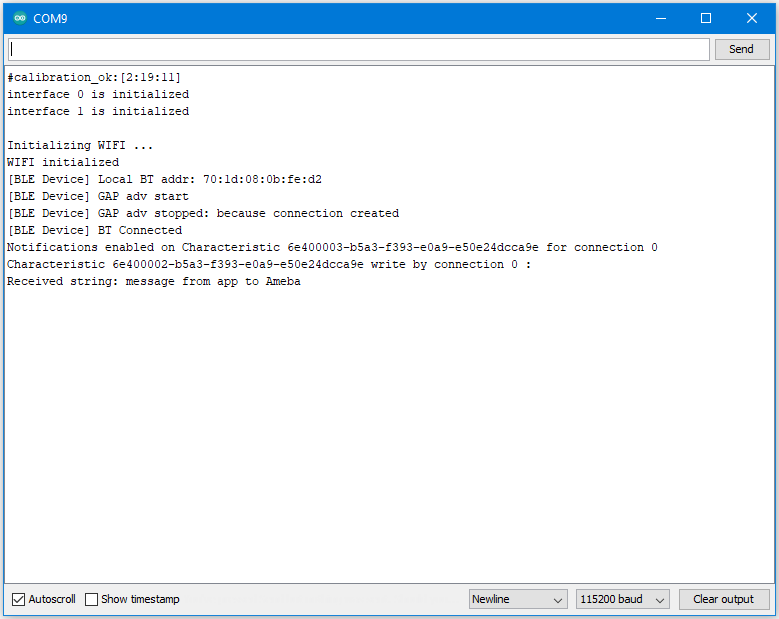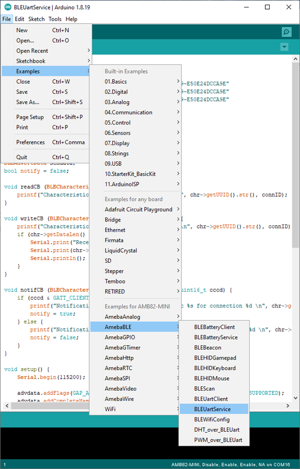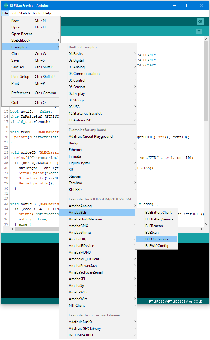 Open the example, Files -> Examples -> AmebaBLE -> BLEUartService