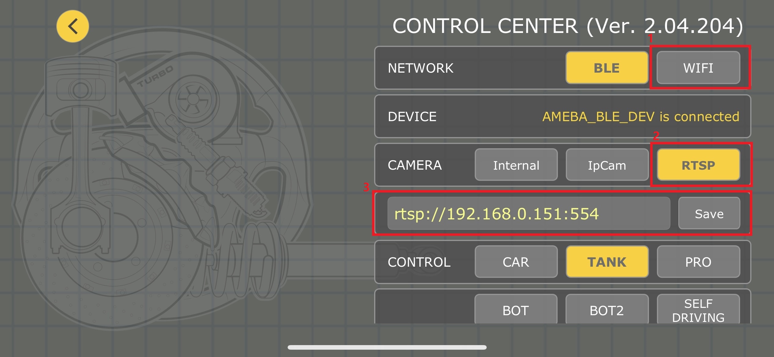 In this example, we will use Ameba board as the BLE Peripheral device and the servo motor controller to communicate with the V7RC mobile app. Besides, video will be streamed from the on-board camera sensor (JXF37P) to V7RC mobile app via RTSP (Real Time Streaming Protocol). V7RC is a remote controller APP that provides two kinds of control UI: one is 2 channels for RC cars, and the other is 4 channels for tanks and bulldozers.