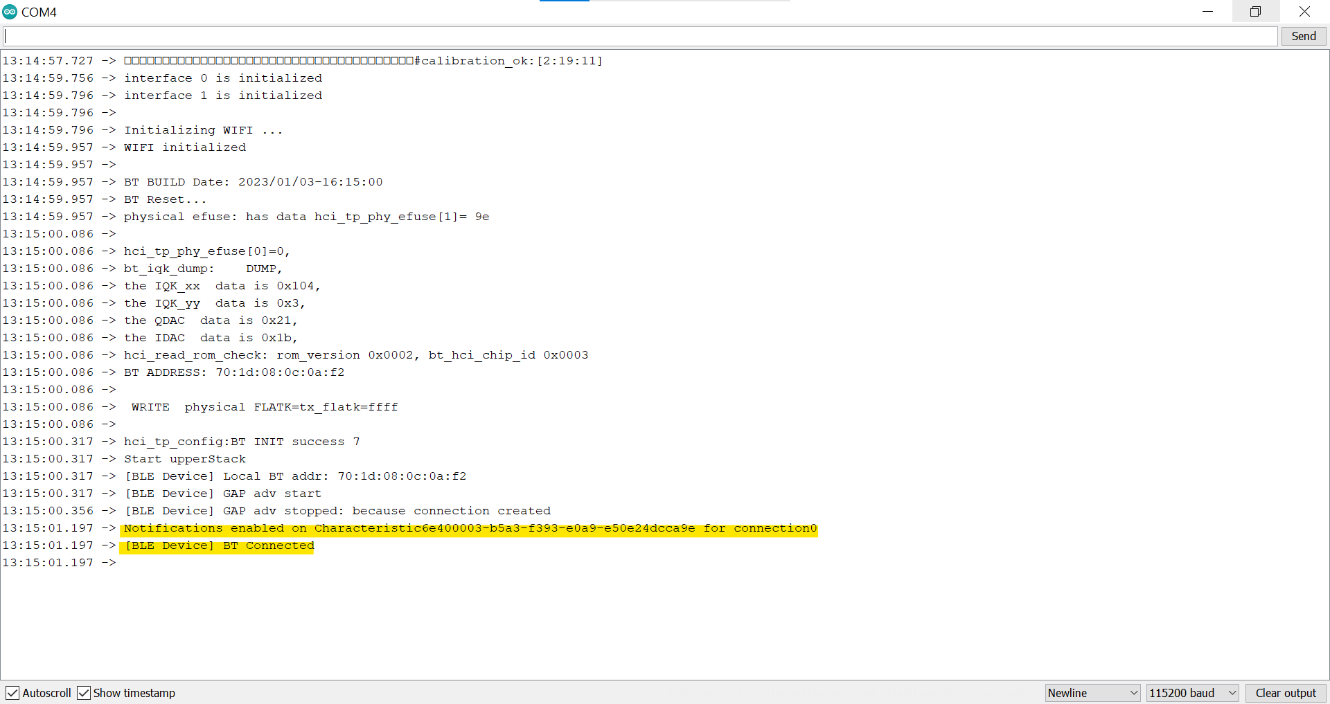 Open the Arduino serial monitor, and you should see log of Ameba board is successfully connected to mobile phone: