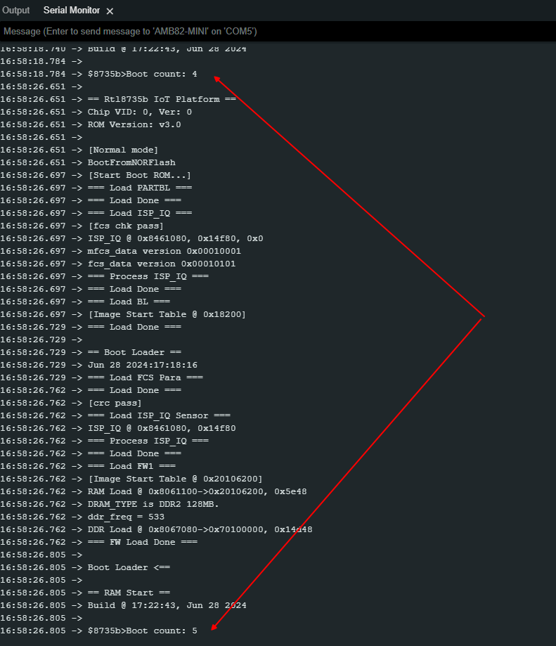 Open the sample code in File -> Examples -> AmebaFlashMemory -> ReadWriteStream Compile and upload to Ameba, then press the reset button multiple times. Open the Serial Monitor, review the result.