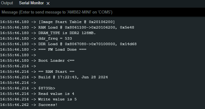 Open the example, File -> Examples -> AmebaFlashMemory -> ReadWriteWord Compile and upload to Ameba, then press the reset button multiple times. Open the Serial Monitor, review the result.