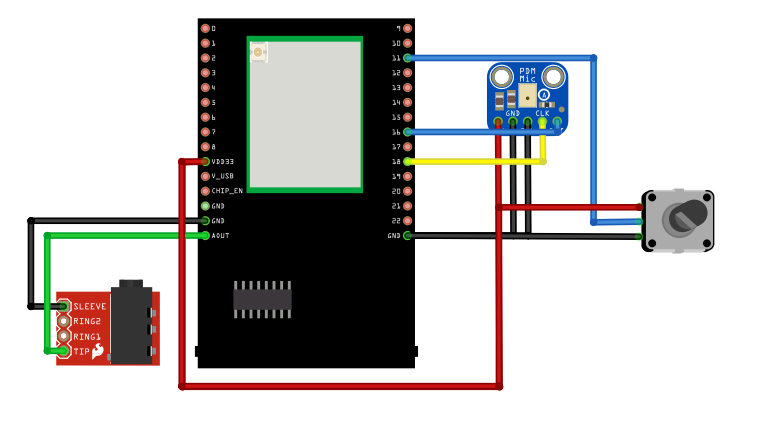 Alternatively, connect the audio jack, potentiometers, and PDM Microphone as shown in the diagram below if you would like to use a digital microphone.