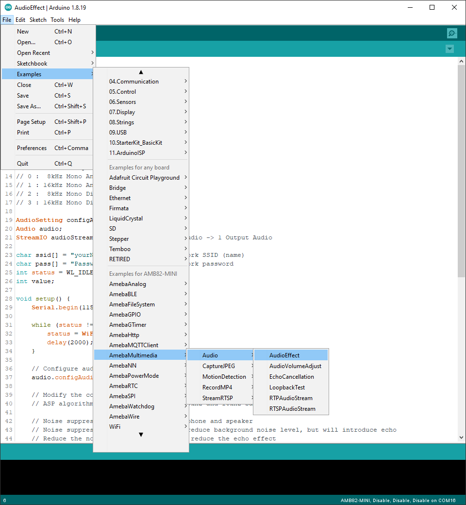 Open the example in File -> Examples -> AmebaMultimedia -> Audio -> AudioEffect