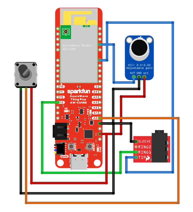 Connect the potentiometer, microphone and 3.5mm connector to the Amrba board following the diagram.