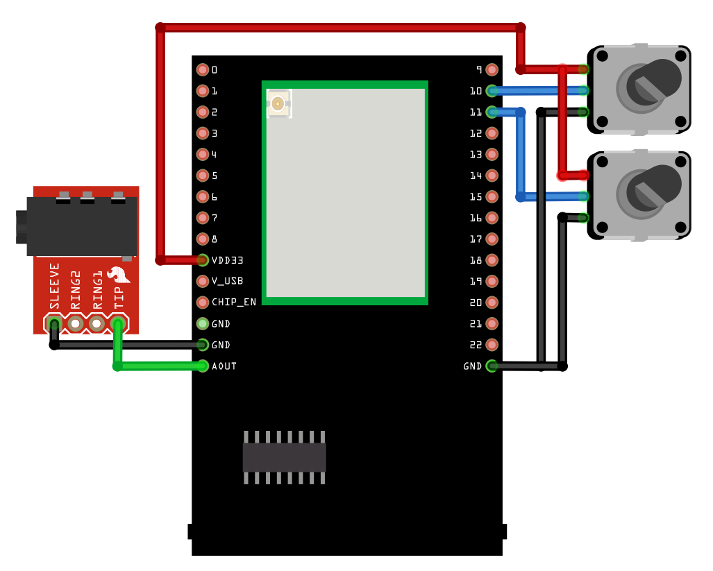Connect the audio jack to the Ameba board as shown in the diagram, you may ignore the potentiometers connection for this example.