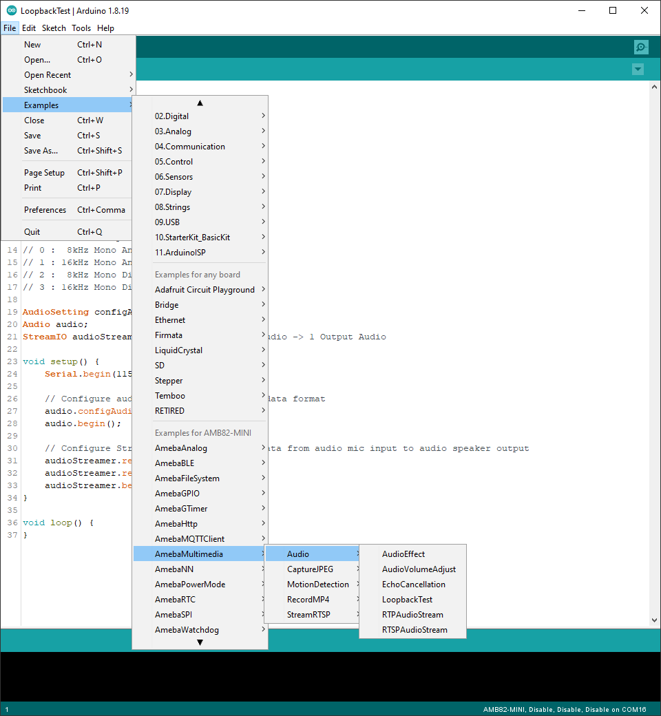 Open one of the Audio examples in File -> Examples -> AmebaMultimedia -> Audio -> LoopbackTest