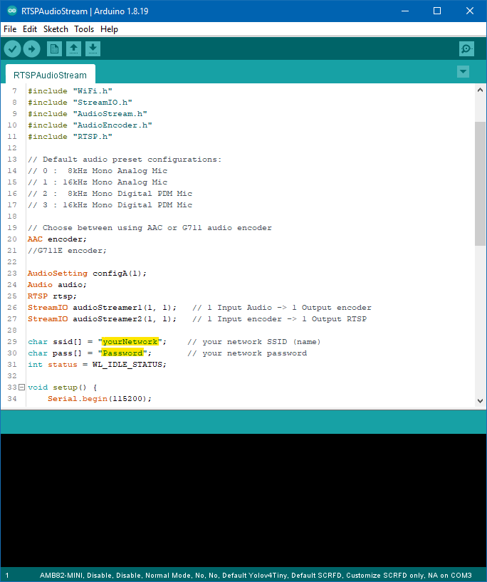 Open the example in File -> Examples -> AmebaMultimedia -> Audio -> RTSPAudioStream