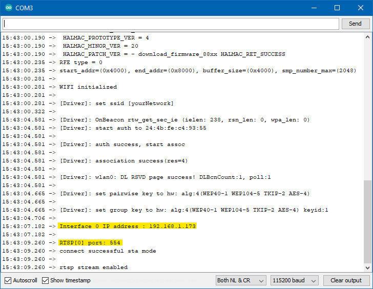 After pressing the Reset button, wait for the Ameba Pro 2 board to connect to the WiFi network. The board’s IP address and network port number for RTSP will be shown in the Serial Monitor.