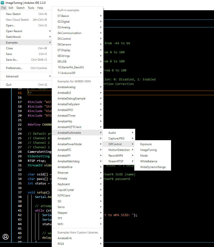 Open one of the ISP Control examples in File -> Examples -> AmebaMultimedia -> ISPControl