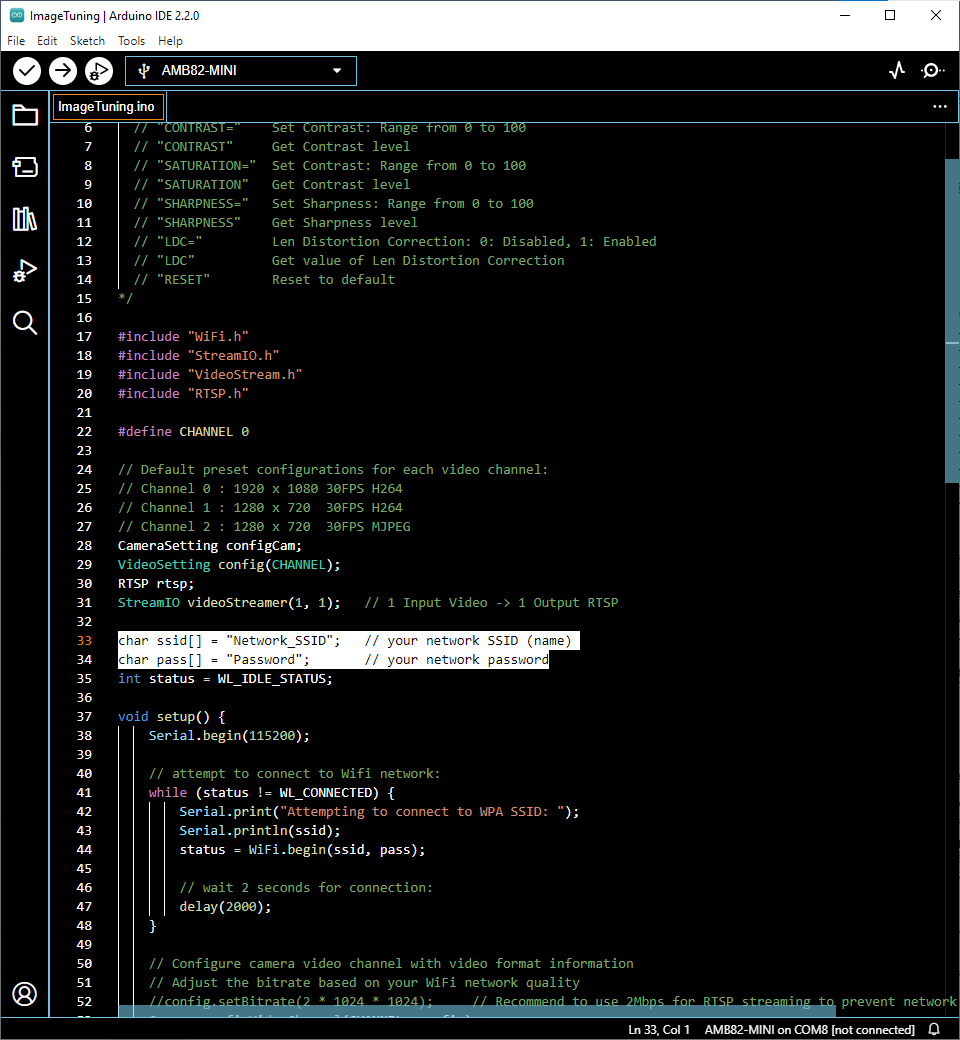 Compile the code and upload it to Ameba. After pressing the Reset button, wait for the Ameba Pro 2 board to connect to the WiFi network. The board’s IP address and network port number for RTSP will be shown in the Serial Monitor.