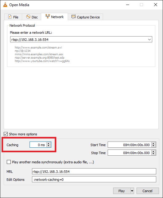 You may choose to change the caching time in Show more options. A lower cache time will result in reduced video latency but may introduce playback stuttering in the case of poor network conditions.