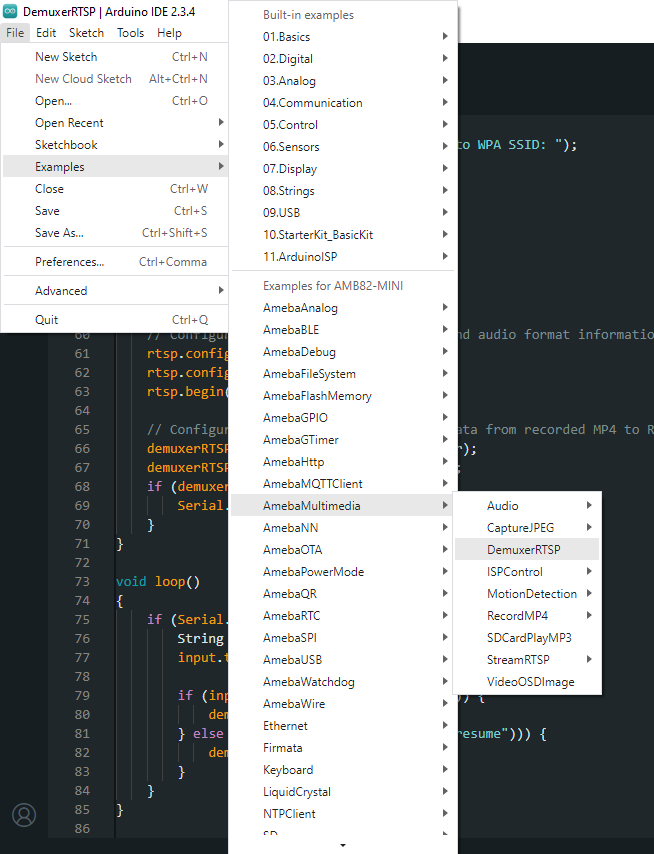 Open the example in File -> Examples -> AmebaMultimedia -> DemuxerRTSP