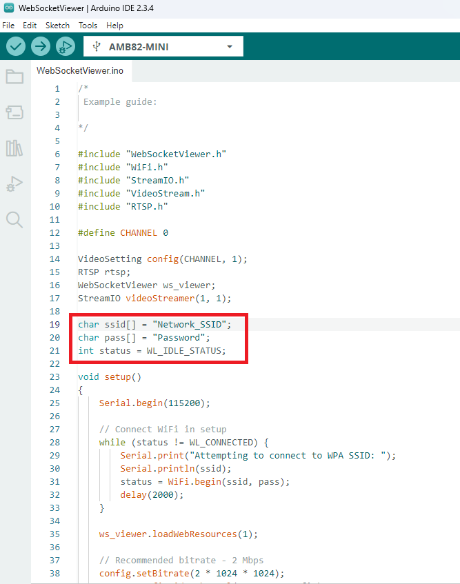 In the highlighted code snippet, fill in the ssid with your WiFi network SSID and pass with the network password.