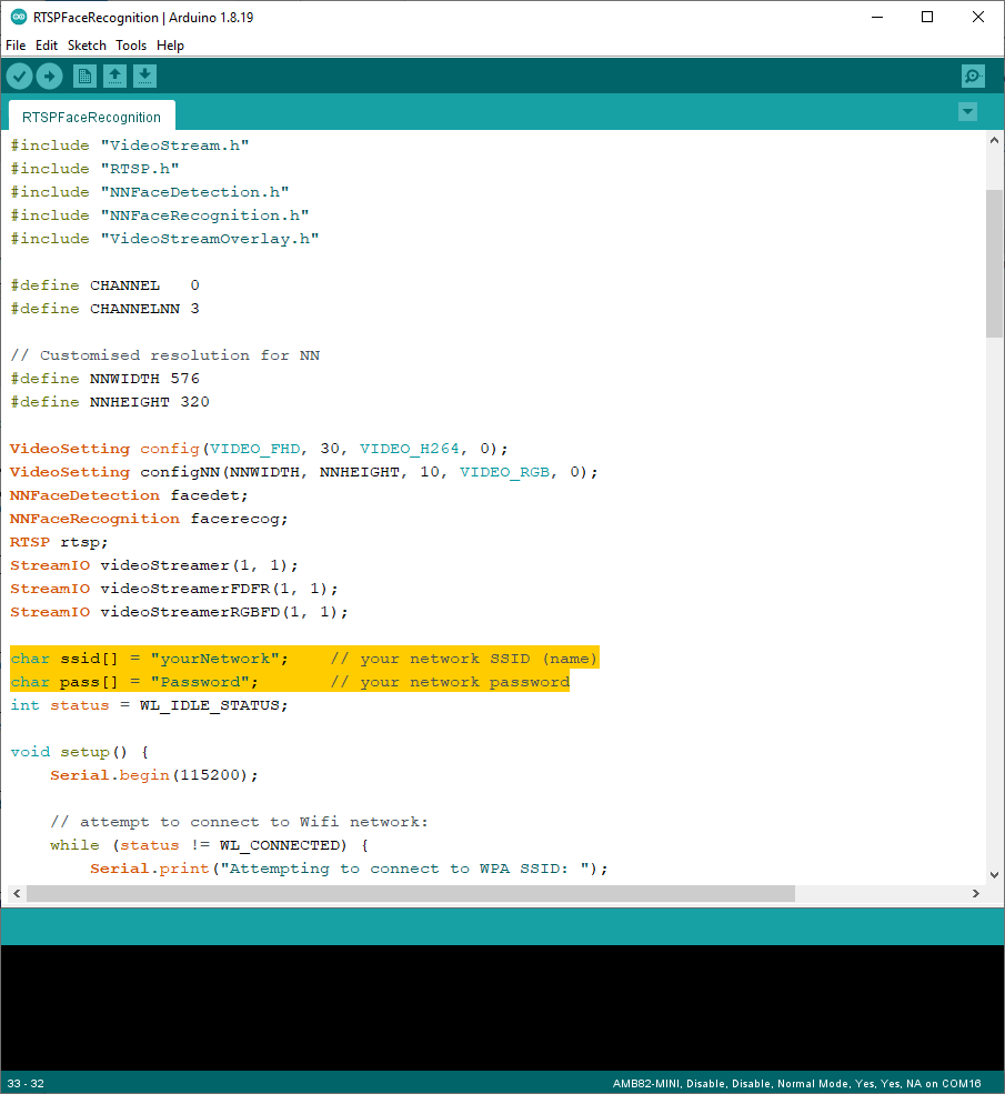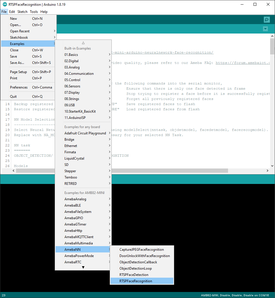 Open face recognition examples in File -> Examples -> AmebaNN -> RTSPFaceRecognition