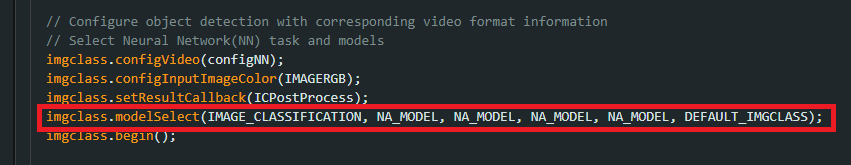 Select Neural Network (NN) task and models using modelSelect() function highlighted in a red box. This function takes 6 arguments: Neural Network task, Object Detection model, Face Detection model and Face Recognition model, Audio Classification model and Image Classification model. Replace with NA_MODEL if they are not necessary for your selected Neural Network task. Note that it is mandatory to call modelSelect() function before calling the begin() function.