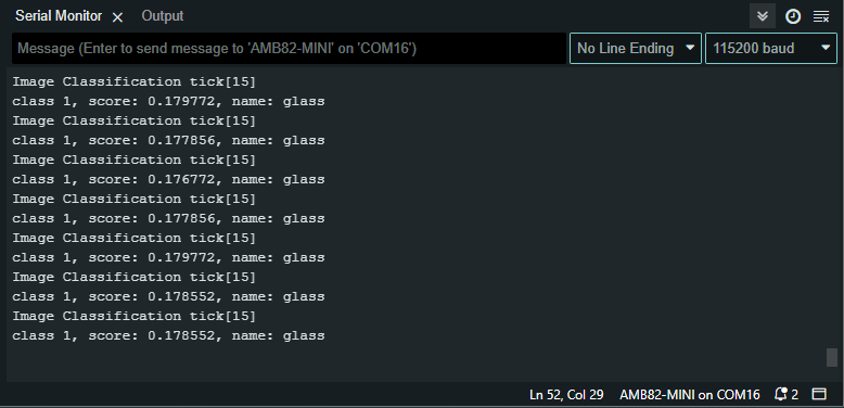 Now, you will be able to see what the camera is capturing. The detected class and its probability will be displayed in the Serial Monitor and at the top-left corner of the video stream.