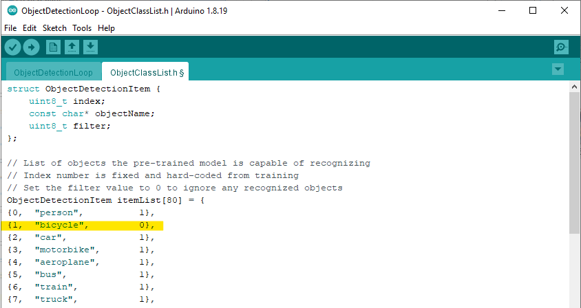 The pretrained model can recognise 80 different types of objects in total. The objects can be found in ObjectClassList.h. The index number for each object is fixed and should not be changed. To deactivate the detection of certain objects, set the filter value to 0. For example, set the filter value to 0 to exclude the detection of bicycles.