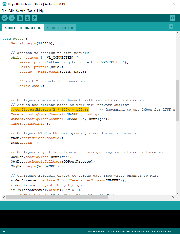 Open one of the Object Detection examples in File -> Examples -> AmebaNN -> ObjectDetectionLoop