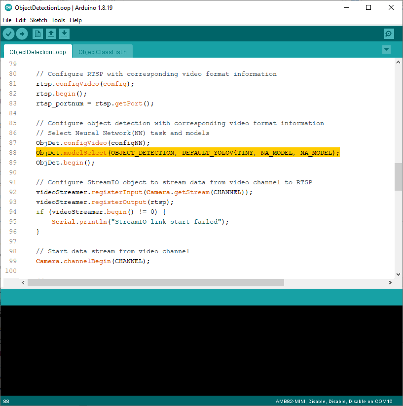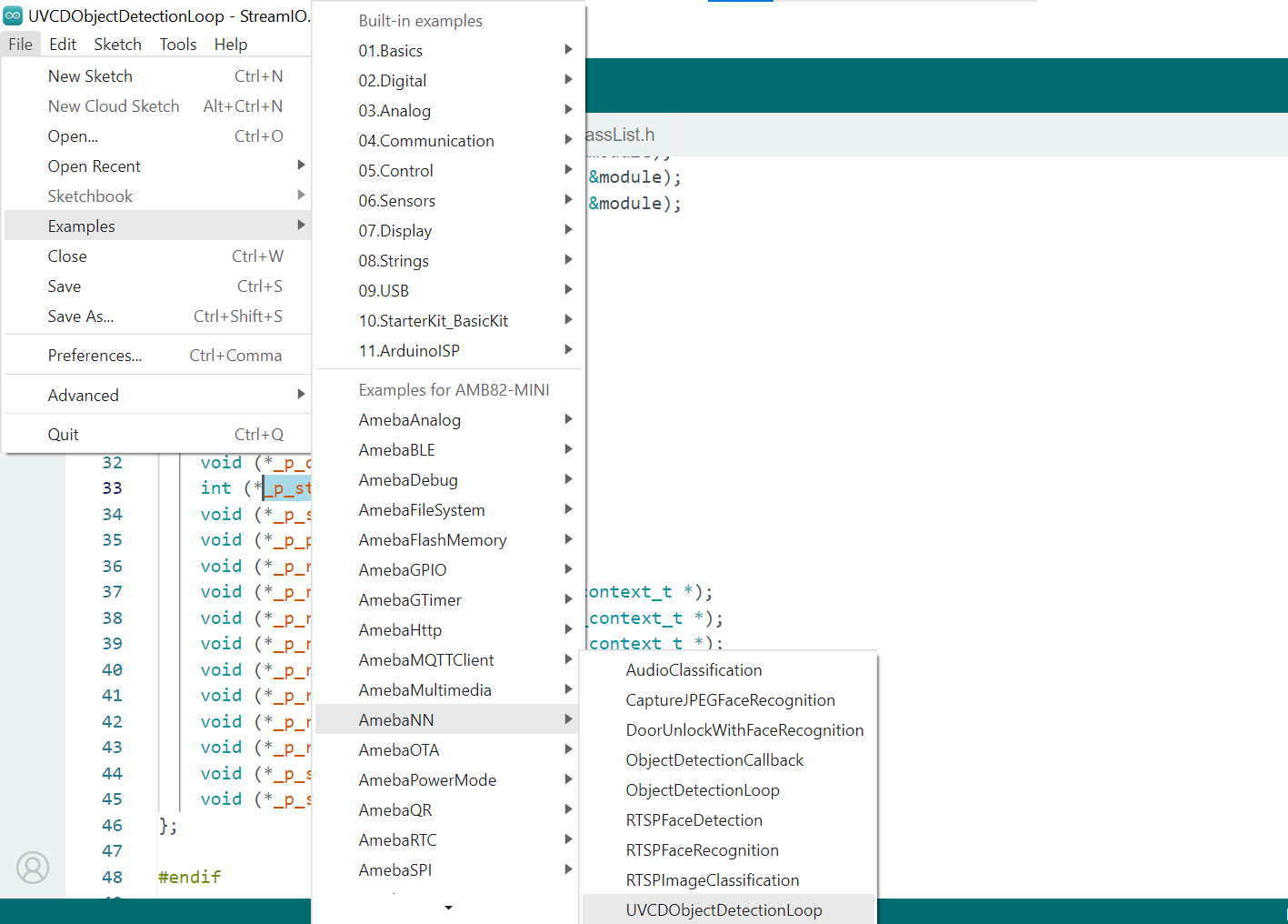 Open the example, File -> Examples -> AmebaNN -> UVCDObjectDetectionLoop
