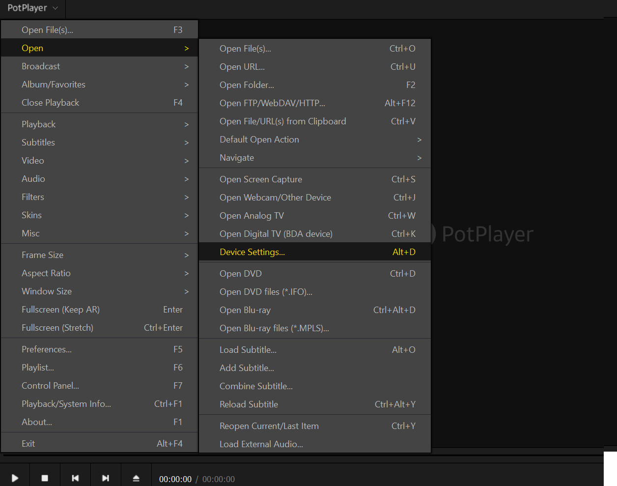 Upon the completion of the software installation, open Potplayer, and go to PotPlayer -> Open -> Device Settings