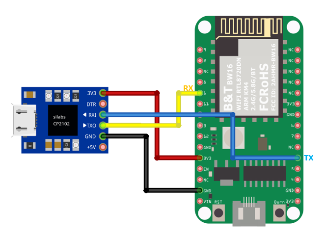 Refer to the BW16 pinmap/layout D0 and D1 pins are used for program uploading. However, onboard USB-to-UART module is connected to D4 and D5 which is not able to be directly used for program upload.