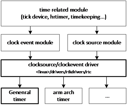 The generic timer can be used as clock source or clock event. Typical usage is as broadcast timer in time subsystem. Architecture of Linux time subsystem is shown below.