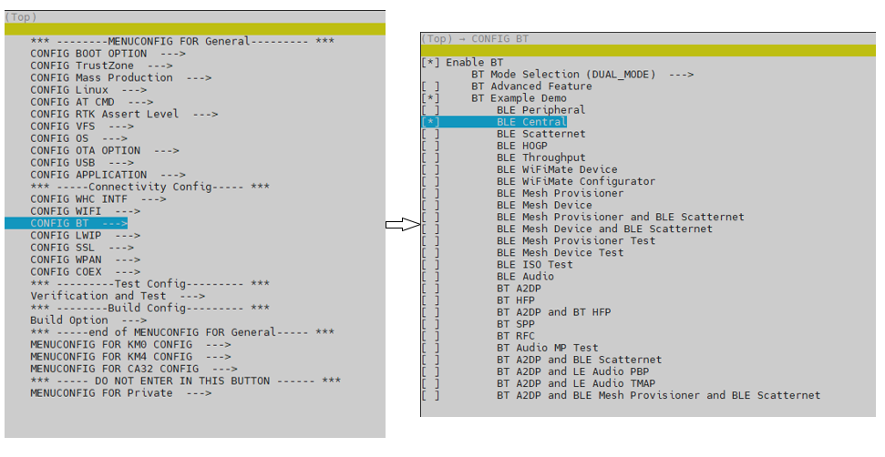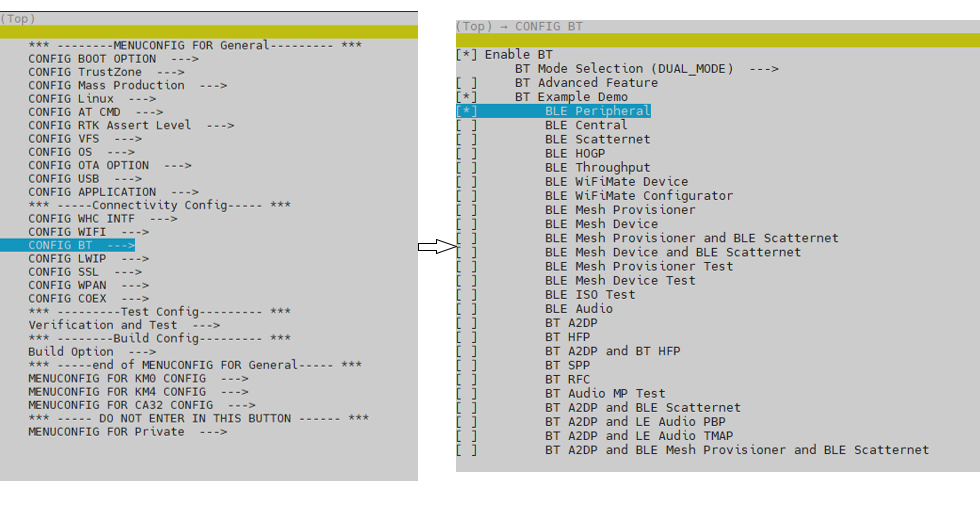 CONFIG BTconfiguration, selectEnable BTto enable the Bluetooth function, selectBLE Audioas well as its included options:BLE Audio Generic Demo,BLE Audio Public Broadcast Profile,BLE Audio Telephony and Media Audio Profile,BLE Audio Gaming Audio Profile。