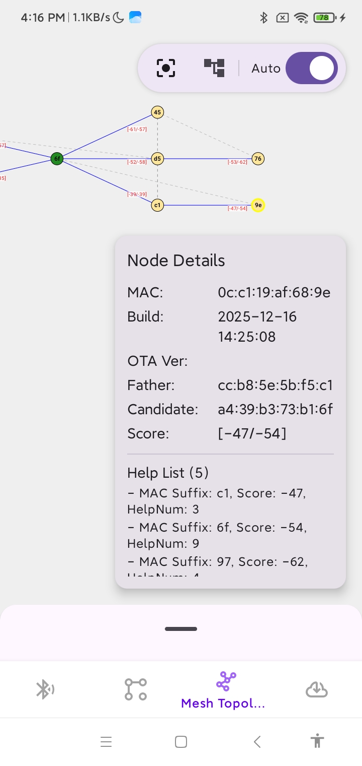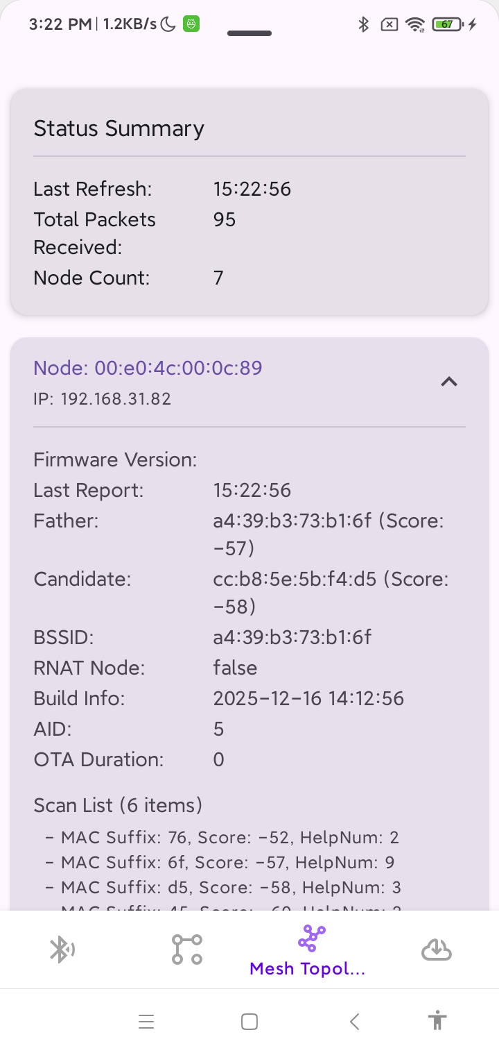List of nearby scanned nodes; each entry includes: the last byte of that node’s MAC address, that node’s score, and the remaining number of child nodes that node can accept |