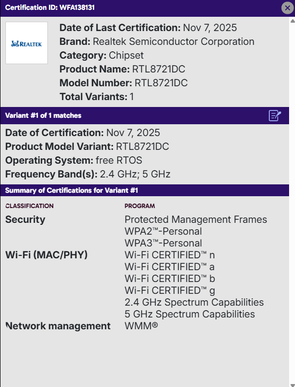 Certificate Link: Visit https://www.wi-fi.org/product-finder and search for “RTL8721DC” to look up the certificate.