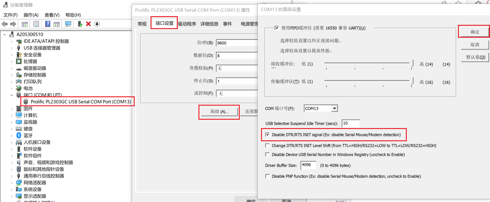Path: PL2303 Port → right-click “Properties” → “Port Settings” → “Advanced” → check “Disable DTR/RTS INIT signal”, then click OK to save.