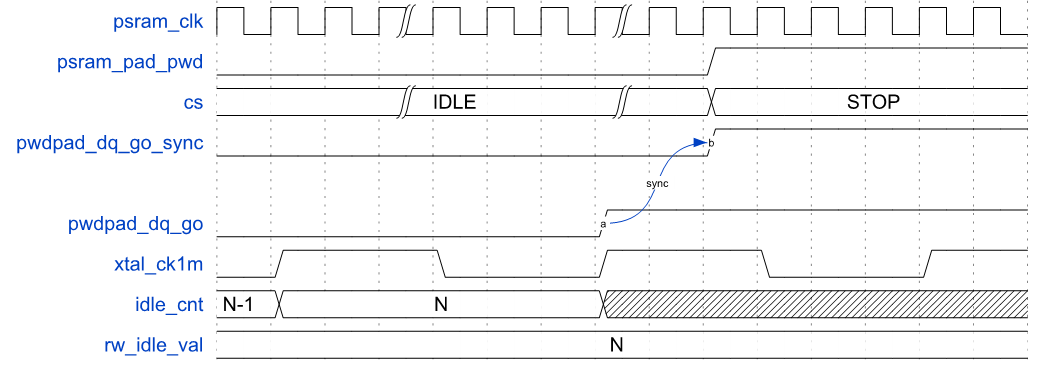 Check if psram controller has axi access, start idle counter when there’s no axi access. Once the idle counter reaching the preset idle value, shutdown DQ pads’ rx path by asserting high to DQ pads’ PD pin and axi access will be blocked. If there is axi access to psram controller afterwards, DQ pads will resume first and this resume process takes tens of nanoseconds(50ns at worst corner). Axi acess will still be blocked until the resume counter reaching the preset resume value