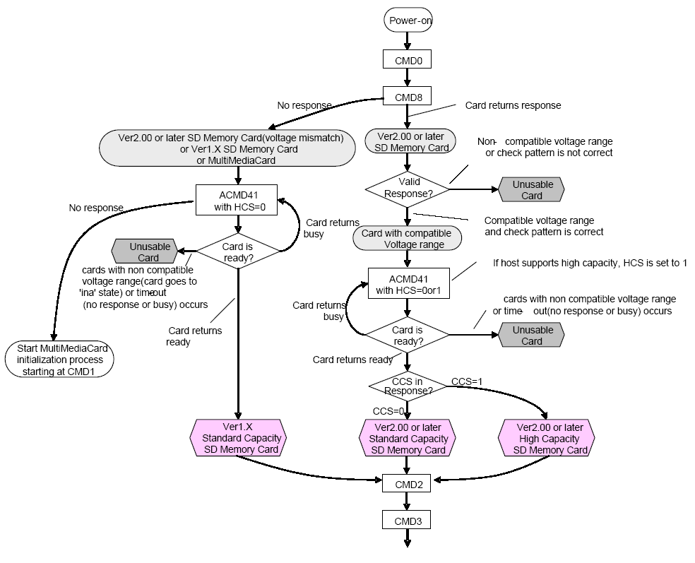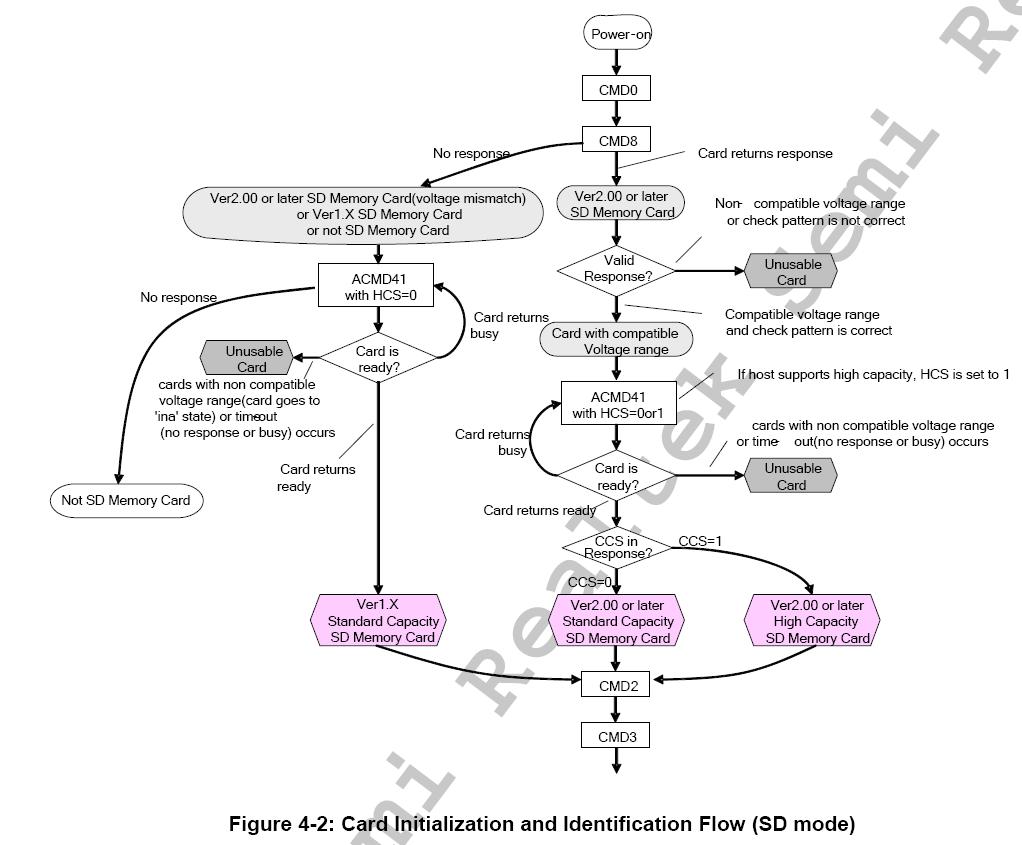 The following diagram is SD Memory Card Initialization and Identification flow: