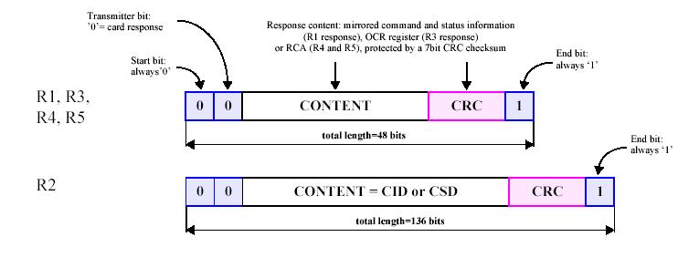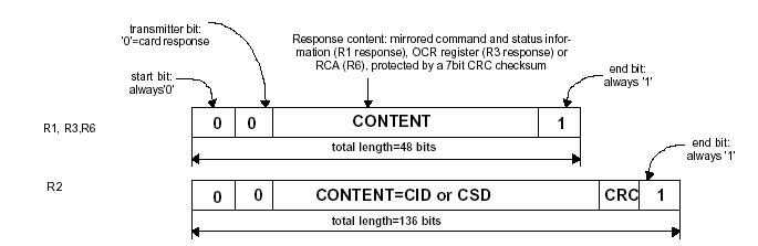 Response tokens have four (SD) or five (MMC) coding schemes depend on their content. The token length is either 48 or 136 bits. The CRC protection algorithm for block data is a 16 bits CCITT polynomial.