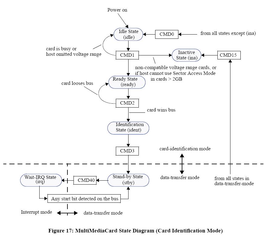The chip will be in card identification mode after reset and while it is looking for new card on the bus. A card will be in this mode after reset until SEND_RCA command (CMD3) is received.
