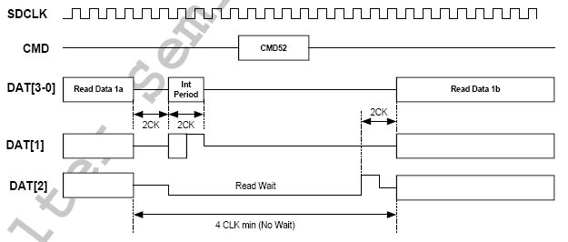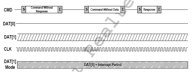 The SDIO card’s interrupt is low-sensitivity, and it use Pin number 8 to interrupt the chip. Since Pin 8 is shared between the IRQ and DAT[1] use in the 4-bit SD mode, an interrupt shall only be sent by the card and recognized by the chip during a special time. The time that a low on Pin 8 shall be recognized as an interrupt is defined as the Interrupt Period. In order to support SDIO Interrupt notification function, the chip hardware shall be capable of detecting interrupt signal on pin DAT[1] regardless of data transfer mode. The chip hardware set 1 to SDIO INT Flag after detecting interrupt signal issued from SDIO card. After interrupt process, the interrupt flag shall be cleared by write 1 to SDIO INT Clear bit. In addition, to be compatible with SD memory card, hardware can enable/disable SDIO interrupt detection function by set/clear SDIO INT Enable0, SDIO INT Enable1. The chip can detect two kinds of SDIO interrupt signals. (Interrupt Period at the Data Block Gap in 4-bit SD mode).