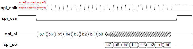 The first type is transmitting only one byte, as shown in the following figure. This type of format is only used in user mode. Users set TMOD, CMD_CH, DATA_CH, and ADDR_CH to zero and store one-byte data to FIFO. After selecting one of the slave devices in SER register, SPIC shifts all the data in FIFO to SPI Flash. Users can use this type to transmit SPI Flash commands such as write enable, write disable, and chip erase.