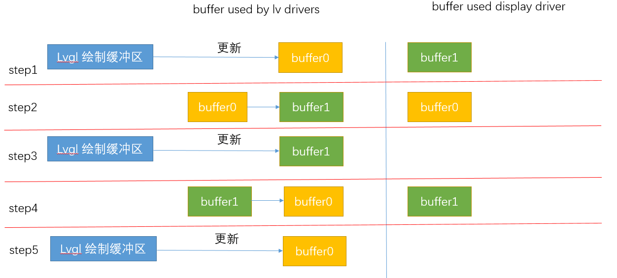 这种方案会需要两个buffer: buffer0, buffer1,用于配置LCDC DMA frame时 Current Frame 与Target Frame 在内存中的 buffer baseaddr(有关配置信息详见后续使用流程章节介绍)。