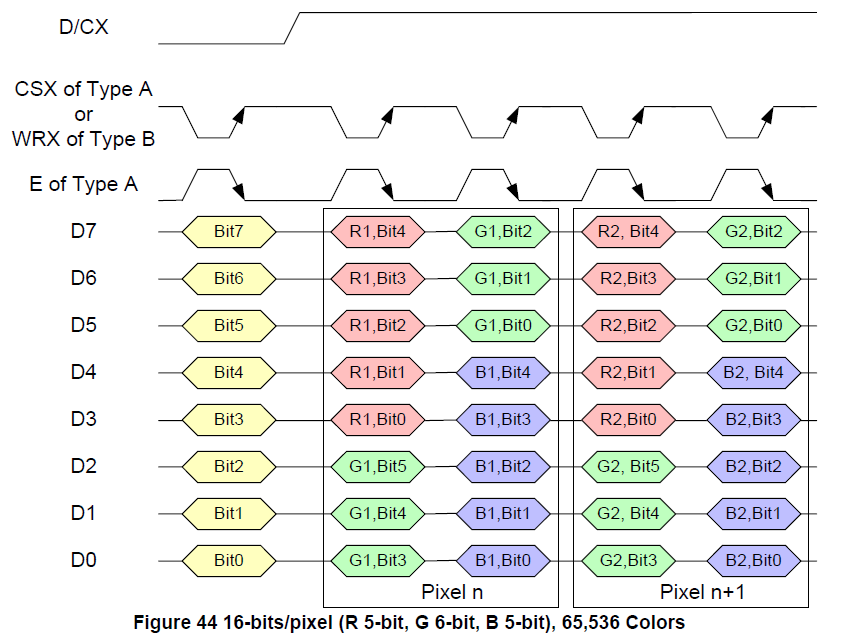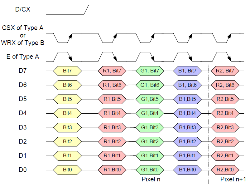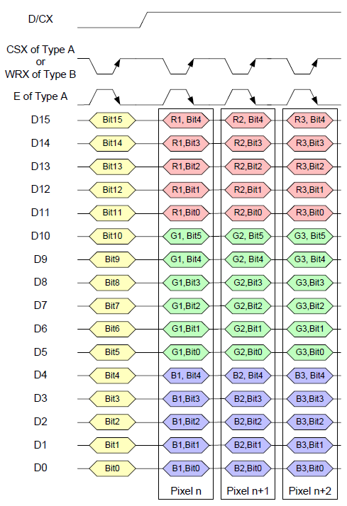 比如对于MCU 8bit-RGB565接口,如下图所示,第一个pixel分两个clock传输,第一个byte是红色5bit和绿色高3bit,第二个byte是绿色低3bit和蓝色bit,有时候这两个byte也可能交换顺序,这种交换无法用format变换实现,只能用byte swap实现。