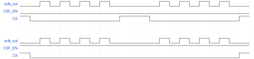When SCPH = 0, data transmission starts from the falling edge of the slave select signal. During continuous data transfers, whether the SPI master’s slave select signal toggles before the next data frame can be configured through the SS_T field in the CTRLR0 register. Regardless of whether the master toggles the slave select signal during continuous data transfers, the SPI slave can communicate normally with the serial master. The timing diagrams for SS toggling and SS non-toggling are shown below. The SS toggling feature is used for compatibility with different SPI devices.